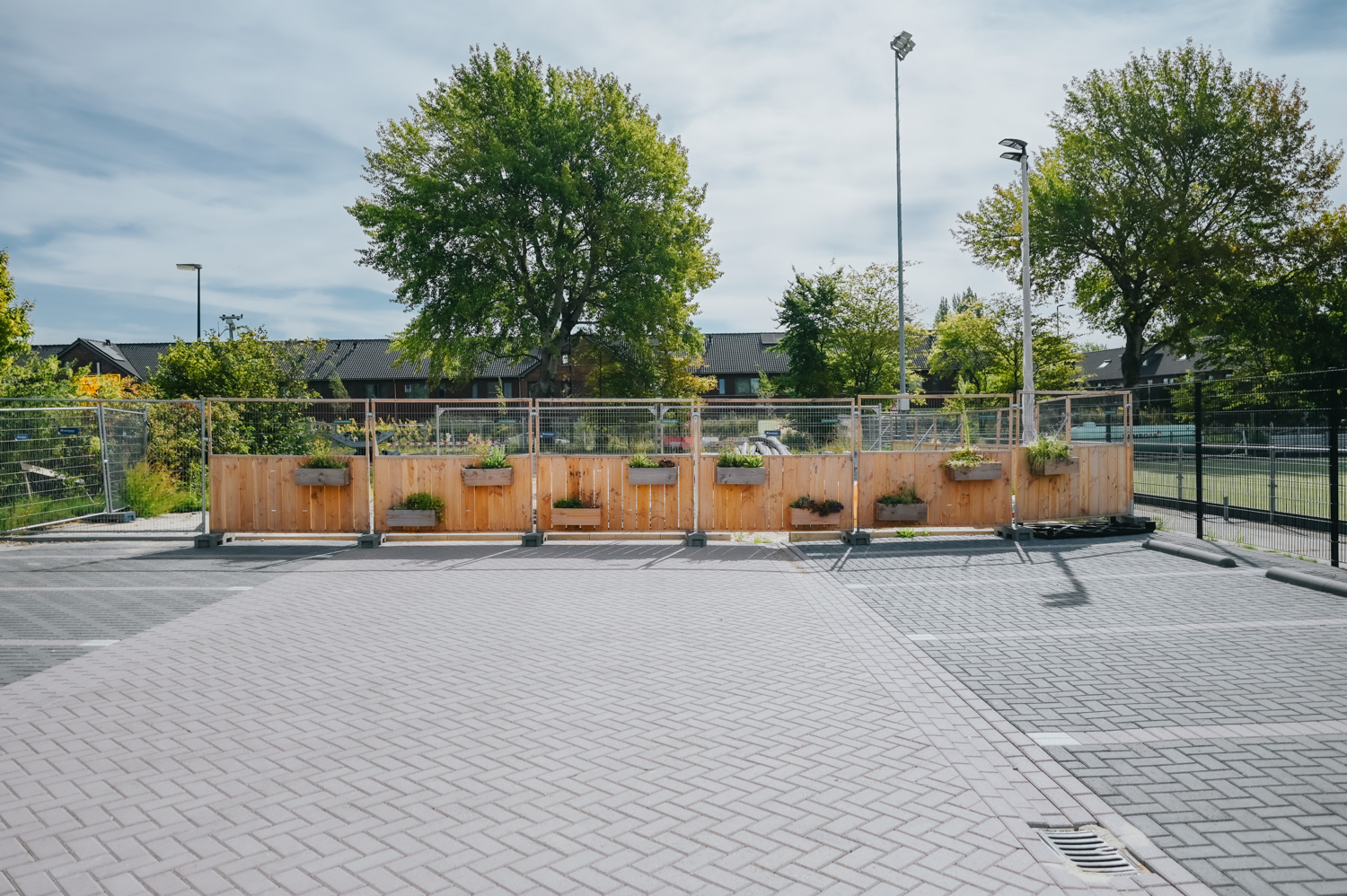 De groene hekken zorgen voor een aangenamer straatbeeld tijdens de werkzaamheden en sluiten beter aan bij de omgeving dan standaard bouwhekken.