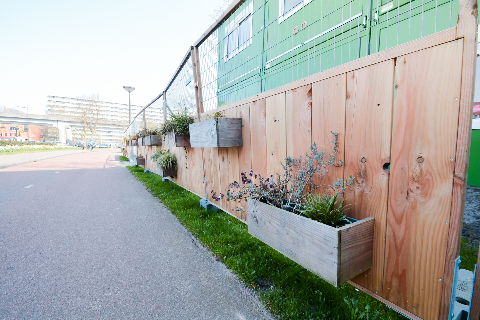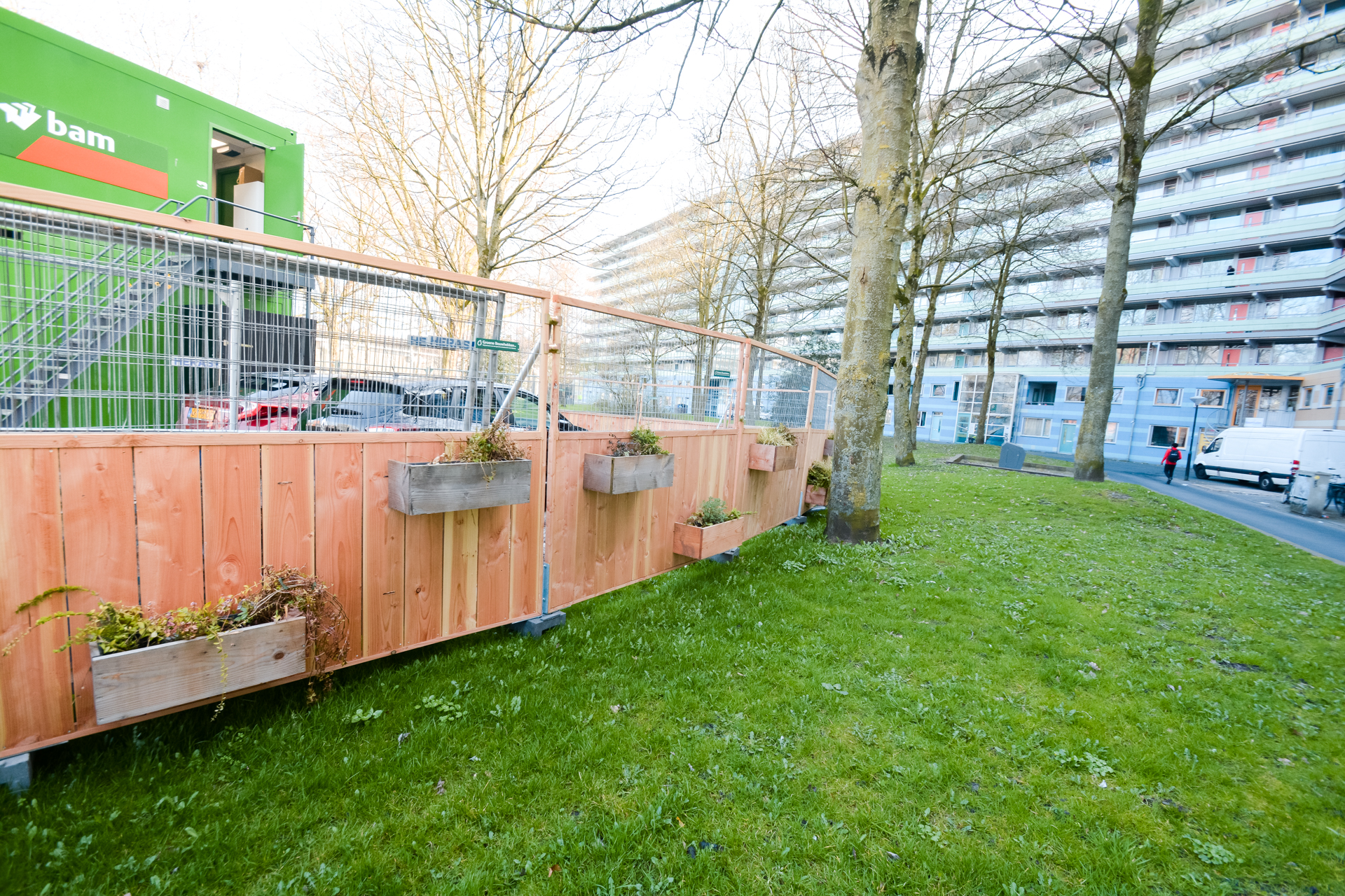 BAM koos voor houten bouwhekken voorzien van plantenbakken. De hekken zijn circulair en gemaakt van PEFC-gecertificeerd hout. Super duurzaam dus! Het bouwhek is half open, zodat voetgangers de vorderingen op de bouwplaats kunnen bekijken, maar automobilisten niet worden afgeleid.