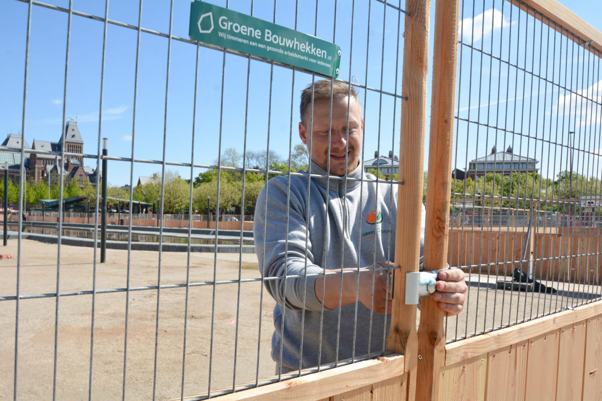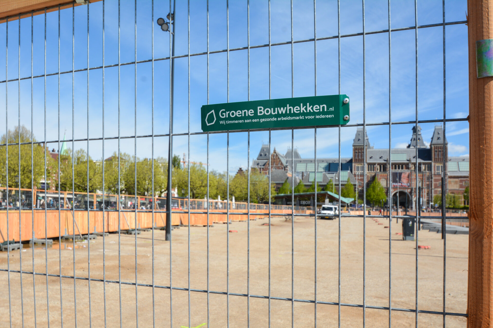 Groene Bouwhekken rondom de vijver voor het Rijksmuseum