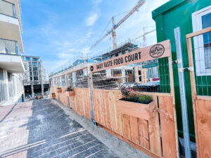 We ontwikkelden ook een unieke bouwafscheiding langs de trap in Groene Bouwhekken stijl, zodat de grote trap die het winkelcentrum met het strand verbindt, beschikbaar blijft. Zo hoeft niemand om te lopen en doet het niets af aan de uitstraling van het project! En ook deze constructie is circulair ontworpen; er zijn bestaande bouwhek-onderdelen gebruikt en het hout kan na terugkomst weer gebruikt worden voor plantenbakken.